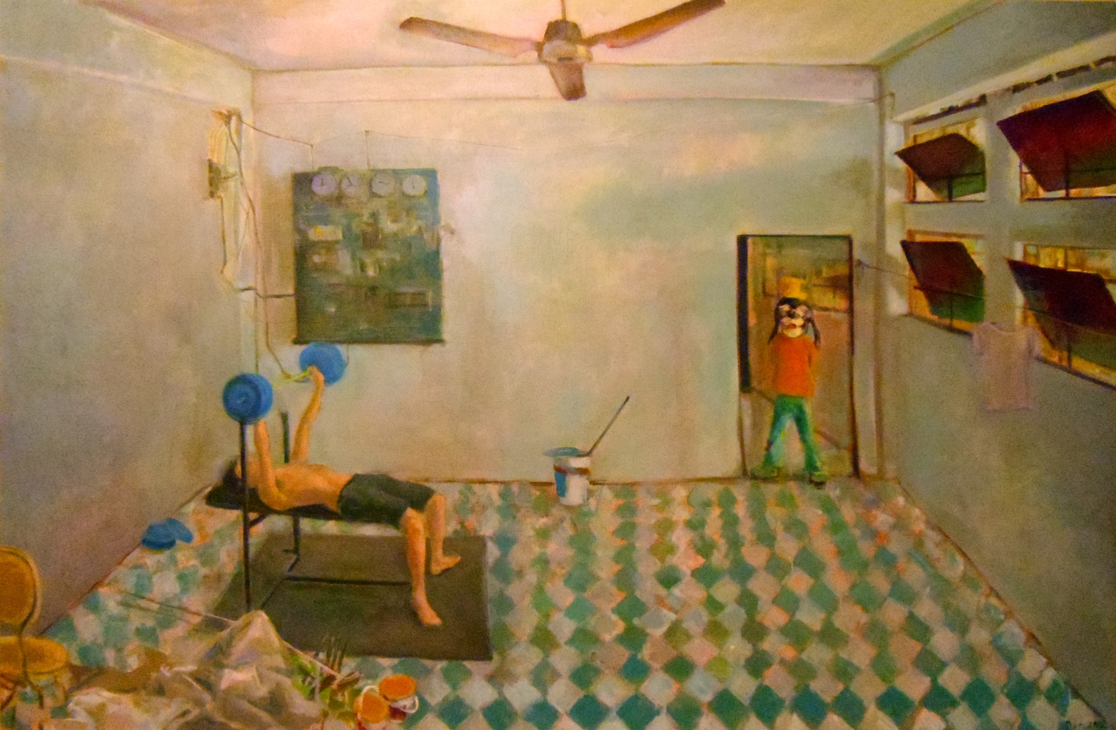 S.: Looking at older work, it seems like your pieces run the gamut from the surreal (such as “What Is to Be Done?”) to the cryptic (“Yellow India”) to more traditional cityscapes. I guess I am curious as to where you feel like your work is heading now. The image that you sent me of a piece to be featured in “Open Casket” shows an image of a figure lifting weights as what appears to be a child wearing a “Goofy” mask stands in the doorway. What is the inspiration behind this? Is there a direct narrative or is it more of an “open door” for the viewer to explore?