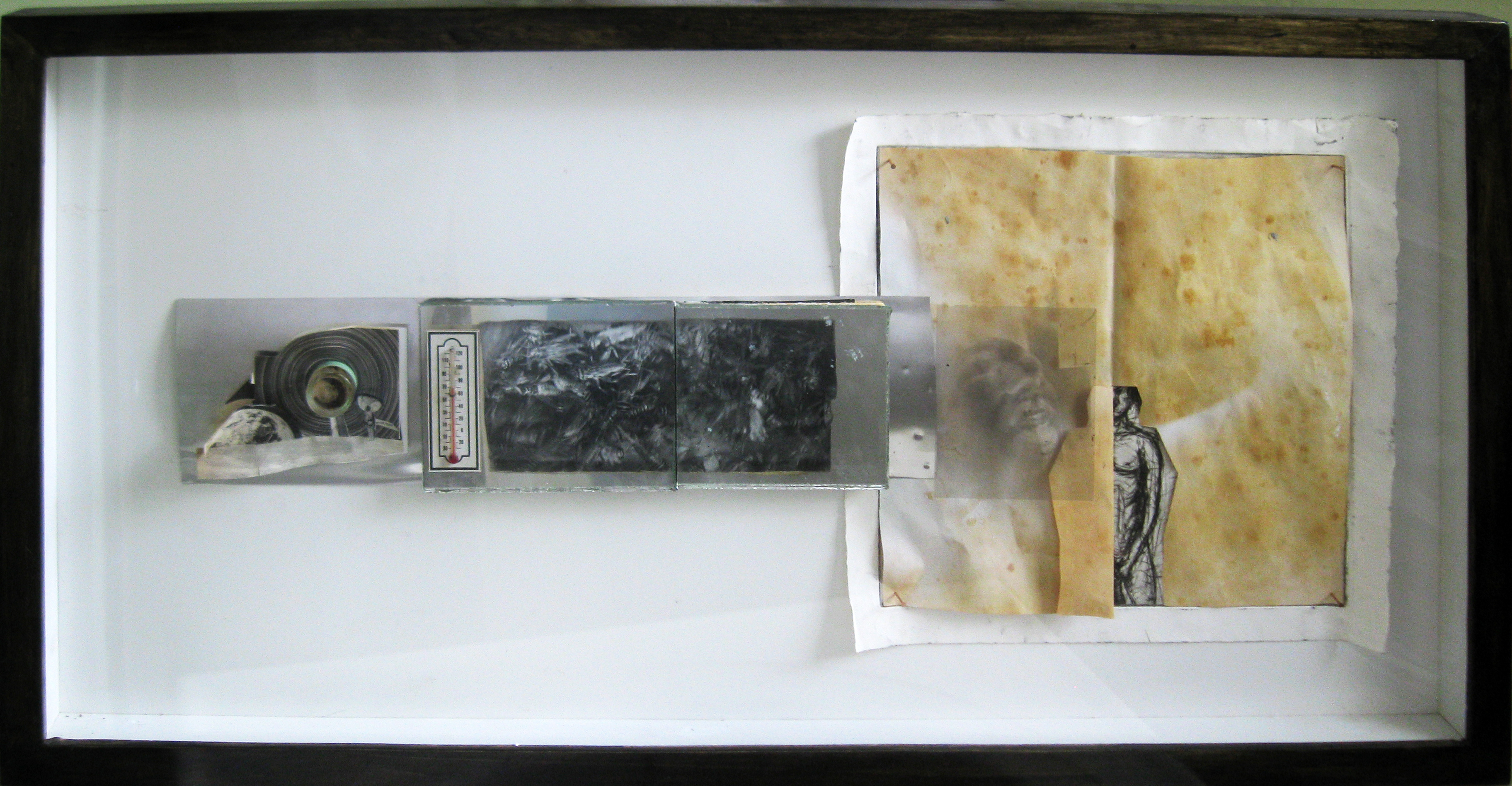 [“Fixation Fluctuation” by Ryan Strasser; 38″ x 20″ x 2″; mixed media (found objects, photo collage, copper dry point etching, and silver gel print.)]