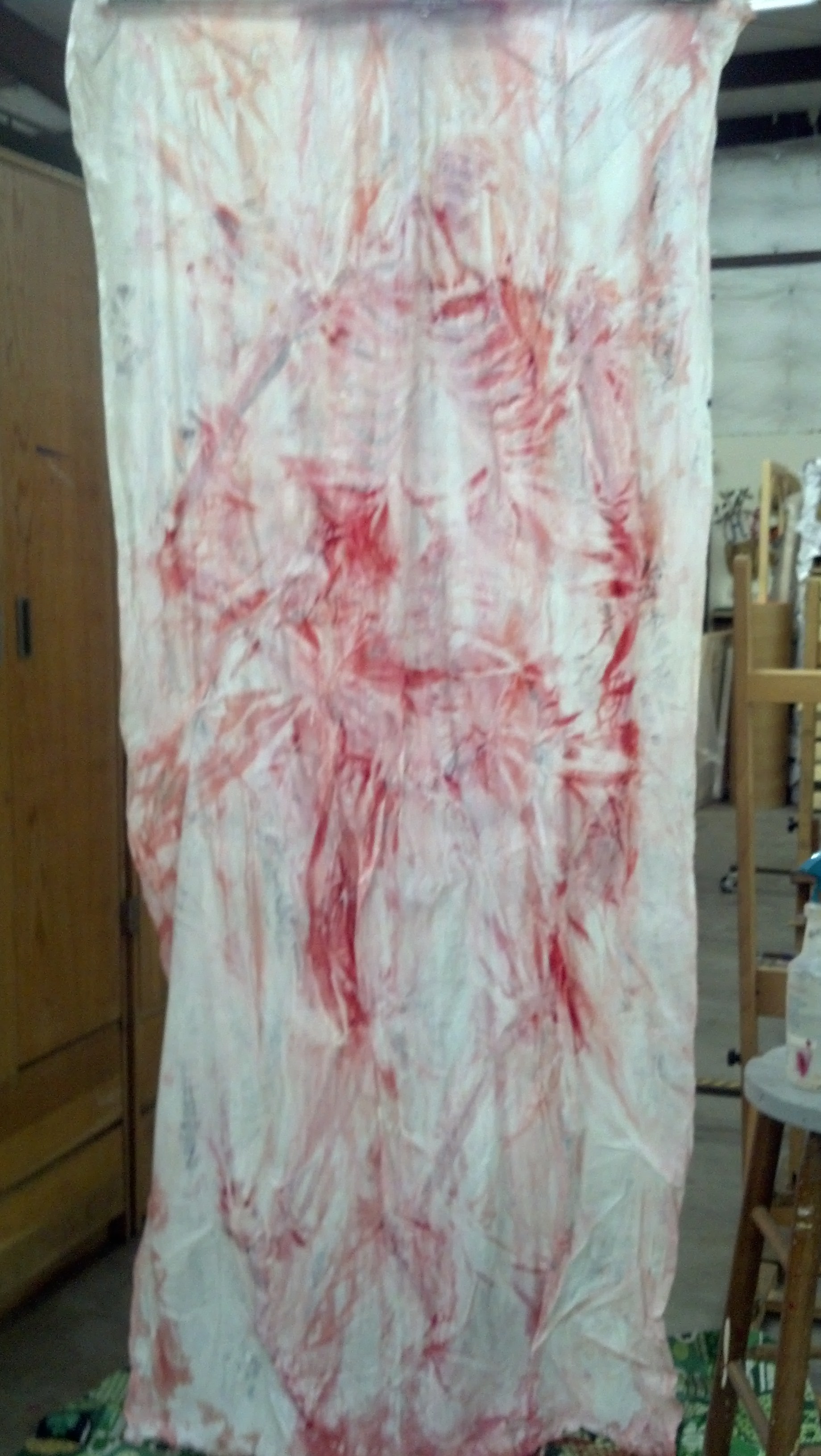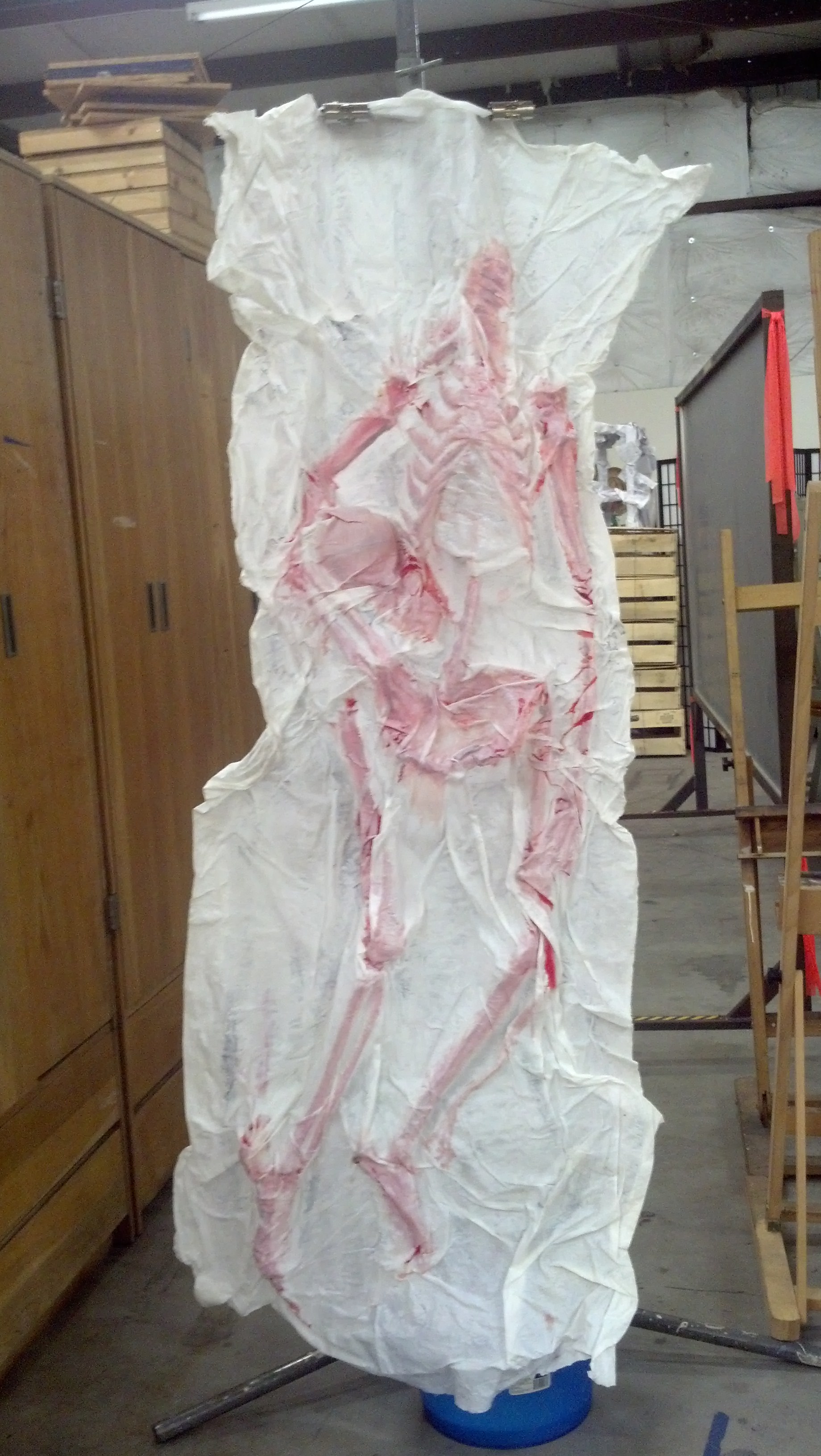 A.G.: As I said in an earlier response, I spent the last few years on my technical skills. Of those two pieces, Wrapped is the older work, prior to my large scale food based paintings. But it was a technique I knew I wanted to return to at some time and I have with this program. But at this time I’m working on a process of both casting and painting (on the reverse side instead) as well as then un-forming the cast into an abstracted image. I consider myself still a representational painter, but I’m very comfortable walking that line between fully rendered and ephemerally abstract. This time at JU I’m going to use to reconcile these sides, hopefully pushing forward into a new way of working. I attached a couple of images just to show you the piece I’m currently focused on. One [top image] is prior to being wet back down; the other [bottom image] is after I’ve been spraying it and layering up more paint.