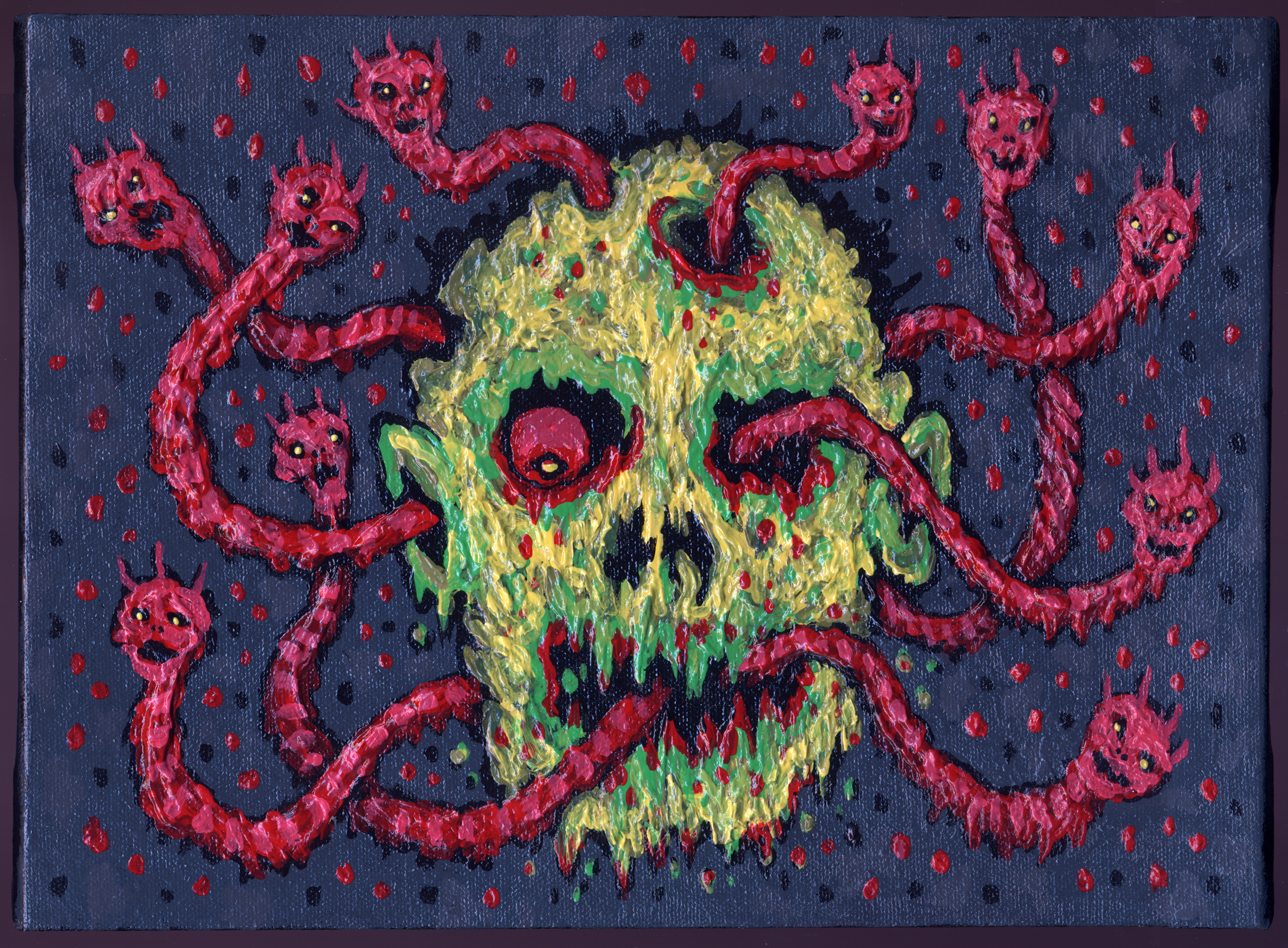 S: Out of all of the artists involved with Art Dorks Rise, your body of work is certainly the most macabre and horror-inspired; it seems to be drenched in these malevolent beings and scenarios that appear to be born or released from supernatural, unholy realm. Yet I had read in a previous interview that you really don’t believe that such a thing exists. Acknowledging that, after decades of focusing your attentions on this subject matter, what sustains your fascination in creating these parallel and horrifying realms?