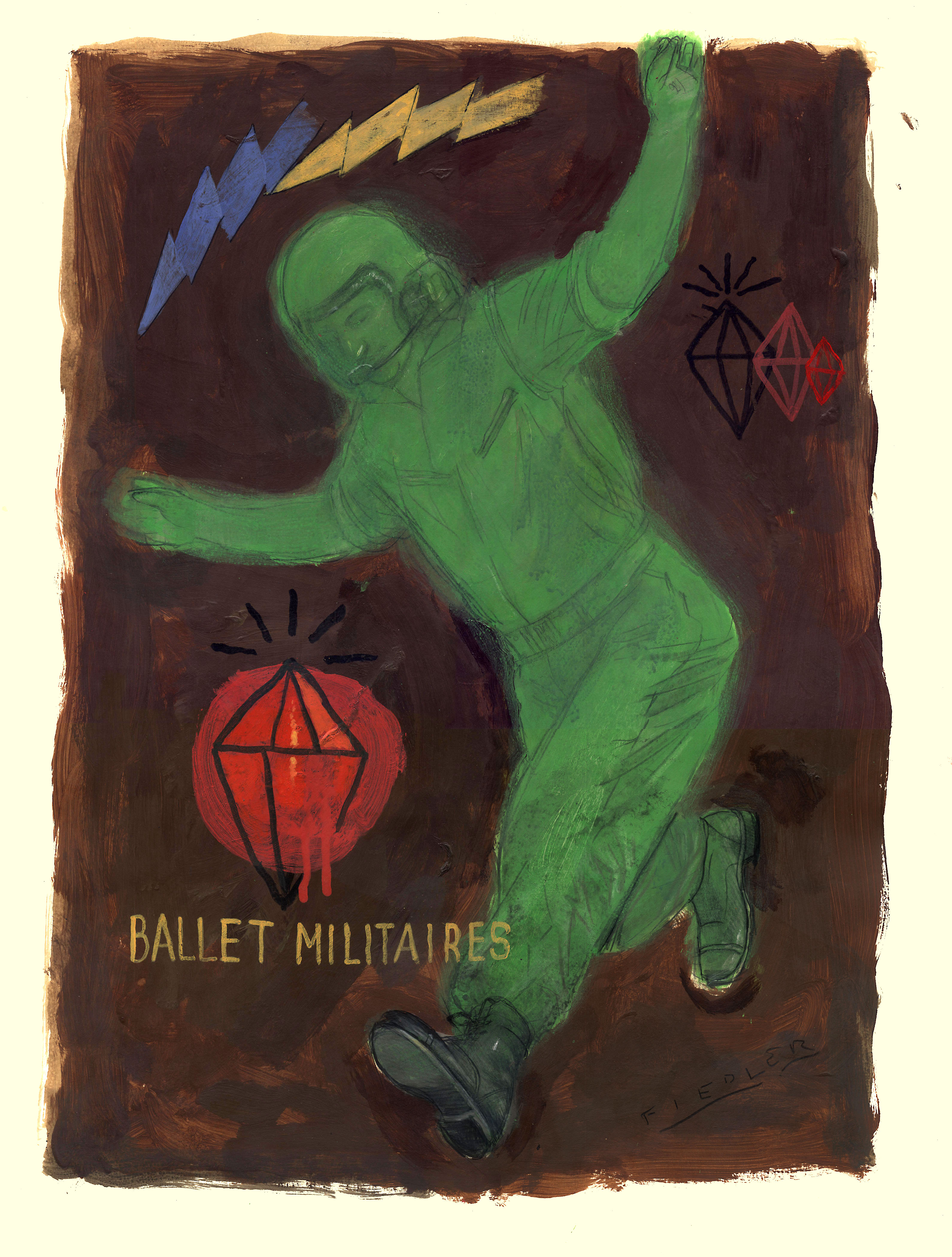 J.D.F.: Ballet Militaires, acrylic and pencil on Stonehenge paper, 27 X 35.5 inches.