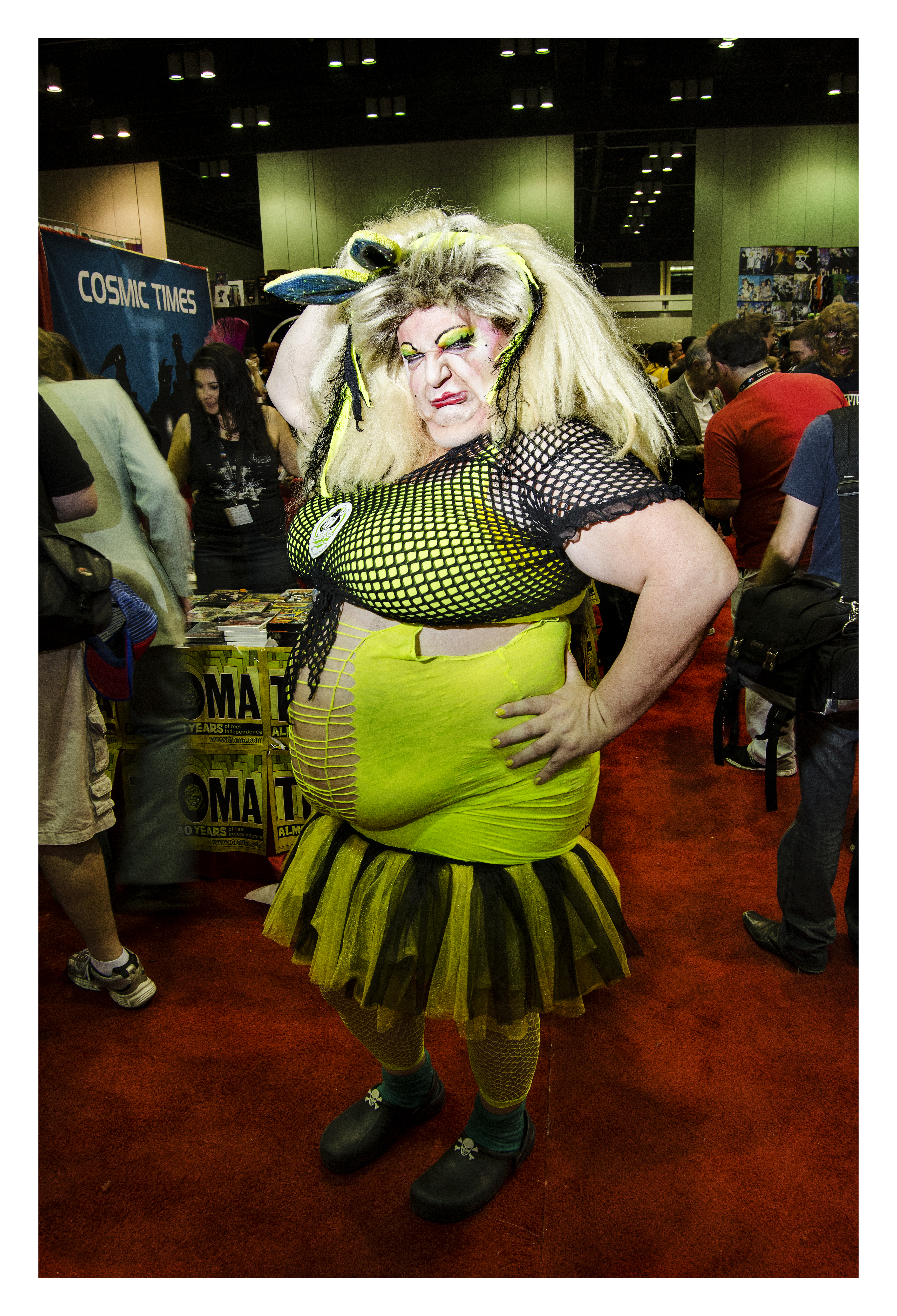 R.B.: And then there are also the people around the photo booth area that are just complete characters, probably in or out of character. Like the guy in that dress [Booth Babe] (…) he was walking around so casually, like he wasn’t wearing an absurd costume. He seemed indifferent to his environment. And I asked, “Hey, can I take your picture?” and that pose just happened immediately; they have it [a pose] in their pocket, ready to go in a second.